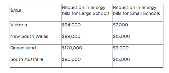Clean Energy Council (CEC) analysis suggests that the program would translate into major savings for Australian schools. A typical smaller schools could save between $7000 – $15,000 per year through the program, depending on their location, electricity use and the terms of their contract with their power company. A larger school could save between $89,000 – $120,000 per year, CEC calculates. These estimates do not include potential additional revenue from the sale of power and other services to the grid.