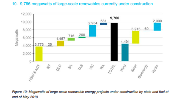 Although they are tracking behind their targets, NSW and Queensland are one of the hottest markets for large-scale renewables construction activity. More than 3,700 MW of new capacity is now under construction in NSW, followed by Victoria (2,954 MW) and Queensland (1,457 MW).