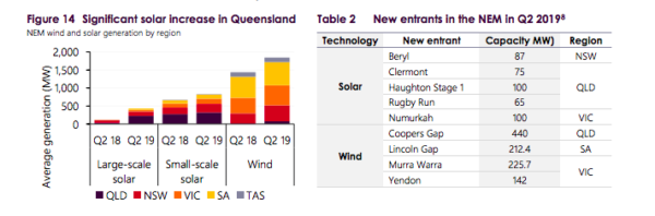 Over the quarter, new projects representing almost 1,500 MW of capacity began generating. Of this new capacity, 427 MW was from solar. Large-scale solar generation increased by 281% to 318 MW as additional capacity was brought online. Most of the increase in large-scale solar output was in Queensland (195 MW, 61% of the increase). Average Q2 2019 rooftop PV generation increased by 19% from 669 MW to 827 MW compared to Q2 2018.