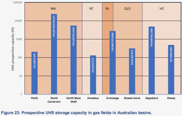 However, the most promising storage options for UHS in Australia might just be depleted gas fields, though it is not clear whether stored hydrogen and residual hydrocarbons would play nicely together. Although the re-use of depleted hydrocarbon reservoirs would be far cheaper than developing UHS-specific salt caverns. But long-term storage operating costs of such a site “may only constitute a small fraction of the total cost of storage”.
