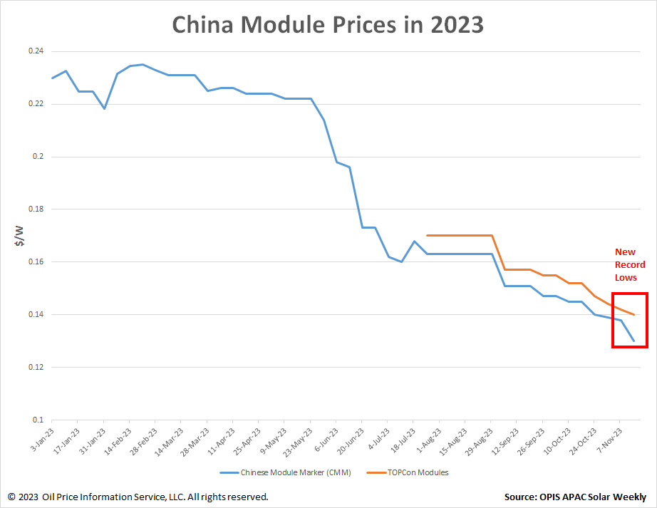 The Chinese Module Marker (CMM), which is the OPIS benchmark for mono PERC modules from China, and TOPCon module prices hit another historical low this week falling USD 0.008 per Watt peak (wp) and USD 0.002/wp to USD 0.130 and USD 0.140/wp respectively, according to OPIS data. Weak market sentiment and lackluster export demand continue to weigh on the module segment.