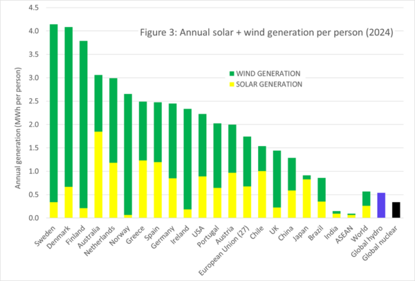 The leading countries for annual per capita solar and wind generation (MWh per person in 2024) are Sweden, Denmark, Finland, Australia and the Netherlands (Figure 3). Sweden and Australia are the champion countries for per capita wind and solar generation respectively.