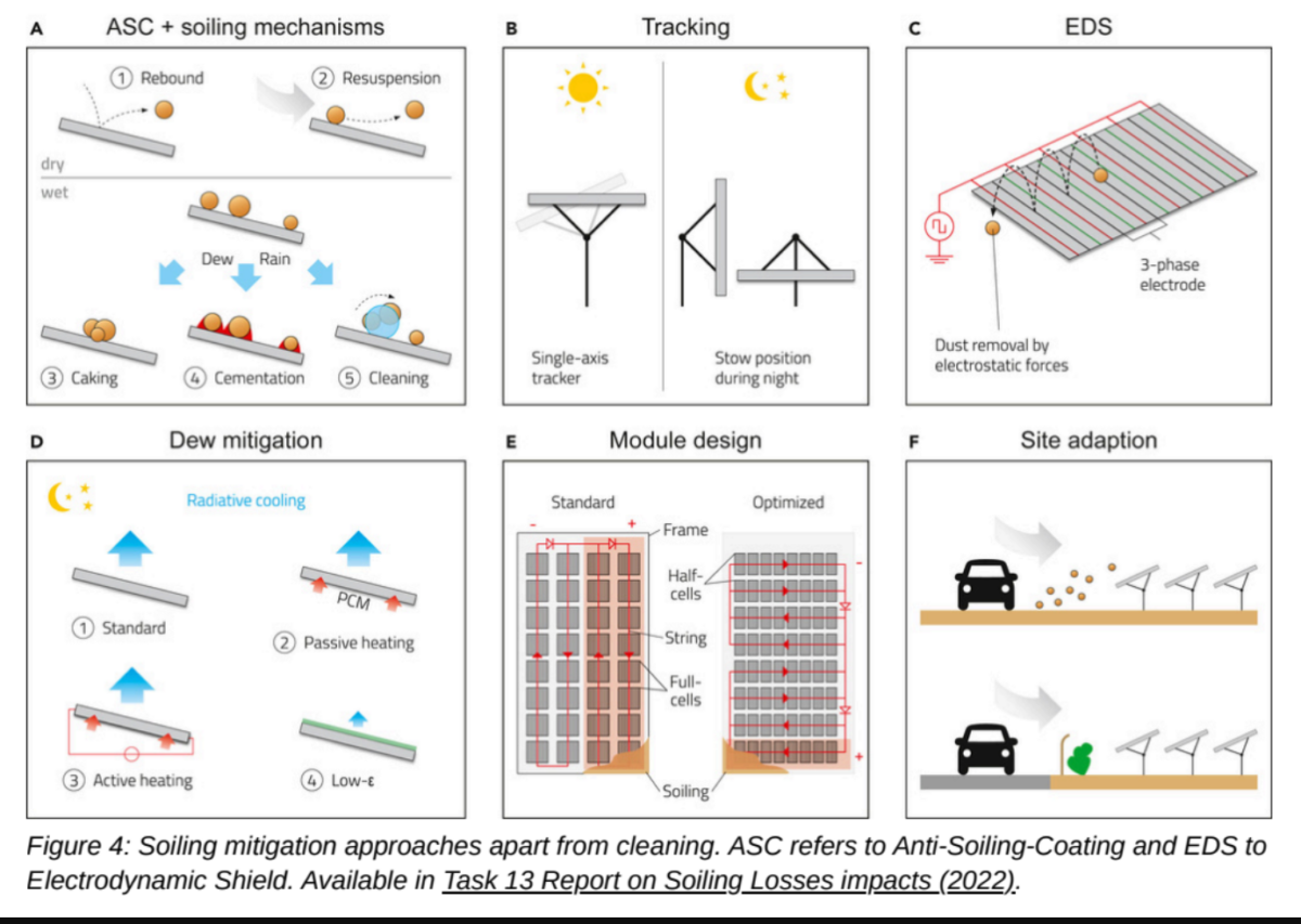 While cleaning is outlined as the most common solution for soiling, IEA-PVPS advises that soiling mitigation should begin before operation through the adoption of soiling prevention measures and designs that facilitate cleaning operations.