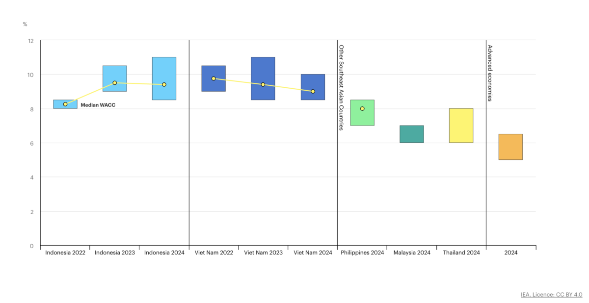 The IEA’s latest update to its Cost of Capital Observatory found that, based on survey responses, the median weighted average cost of capital (WACC) for solar PV in 2024 stood at 9.4% in Indonesia, 9% in Vietnam and 8% in the Philippines. The WACC is nominal, post-tax and adjusted to local currency.