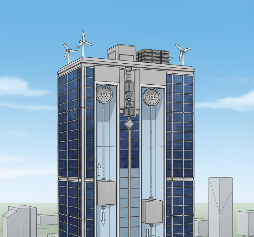 The rope-hoist-based system is designed to operate in combination with photovoltaic facades installed on the south, east, and west walls, as well as small rooftop wind turbines and lithium-ion (Li-ion) batteries.