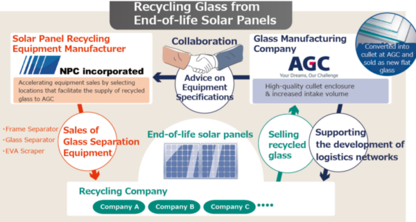 Japanese glass, chemicals, and materials manufacturer AGC said it will collaborate with solar PV equipment manufacturer NPC Incorporated to promote the recycling of solar panel cover glass and its use as part of the raw material used in the production of architectural flat glass.