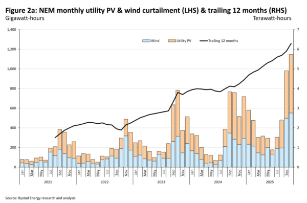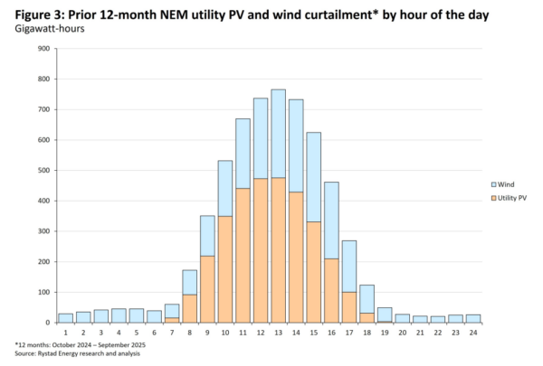 Rystad’s analysis says utility solar and wind facilities in Australia’s National Electricity Market (NEM) curtailed 6.3 TWh of generation over the prior 12 months, equivalent to almost 3% of total NEM annual generation and while the trend appears to be an upward trajectory, several key reasons this could be about to reverse include: