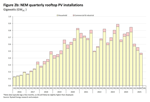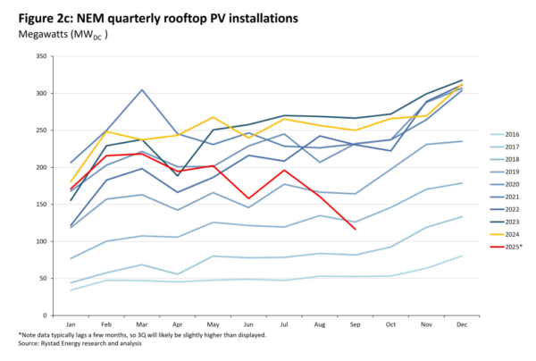 - Rooftop solar generation is one of the primary causes of curtailment during daylight hours, due to the inability to turn down most installed systems. However, 2025 may mark a pivotal year for rooftop solar as it could be the first year of meaningful decline in almost a decade. Rooftop PV installation data typically lags by several months; thus, data for 3Q 2025 will likely be revised upward. However, the data for 1H 2025 shows that monthly rooftop PV installations were lower for every month compared to 2024, as well as for most comparable periods from 2021 to 2023. It is currently unclear whether this represents market saturation in high-penetration markets (such as South Australia / Queensland) or if there are labour constraints due to the boom in household battery installations.