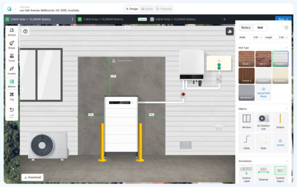 GreenSketch Australia and New Zealand Country Manager Richard Cameron told pv magazine the enhanced platform has numerous home battery configuration templates, that help installers and their customers visualise how an installation can work in the available space.
