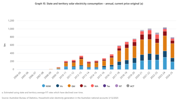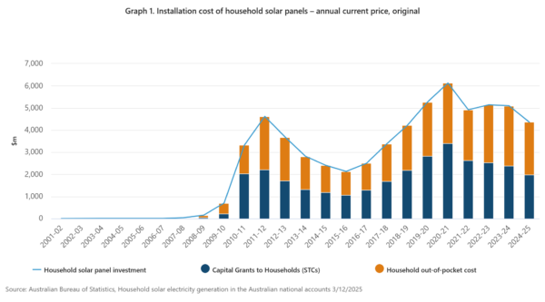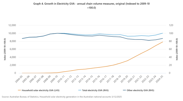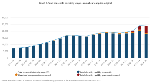 In 2024-25, the total value of electricity usage by households was $23.9 billion, electricity retailers provided $23.1 billion (of which households paid $17.8 billion and $5.4 billion was covered by government rebates) and $798.8 million from household solar generation.