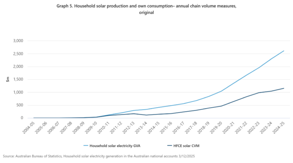 The annual price of HFCE electricity fell 1.4% in 2024-25, compared to the 0.9% fall in the CPI of electricity excluding rebates (year-on-year average). The difference captures the price effect attributable to household solar electricity in the National Accounts.