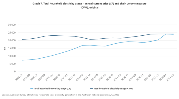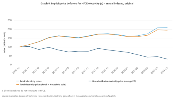 From 2023-24 to 2024-25, the average retail electricity price rose 0.4% while the average price paid by households for electricity, which includes the implicit price of solar, fell 1.4%.