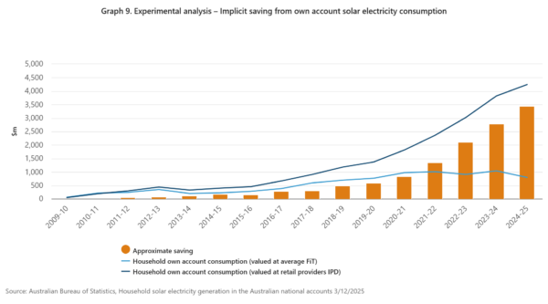 To model an implicit saving to households, household consumption of solar electricity was calculated using both retail prices and FiT rates. Solar consumption quantities (in kWh) were multiplied by retail prices and compared the same quantities valued at FiT rates. This comparison shows a rapid increase in annual saving over time, with a saving of $3.4 billionfor the household sector or $125.74 per capita in 2024-25.