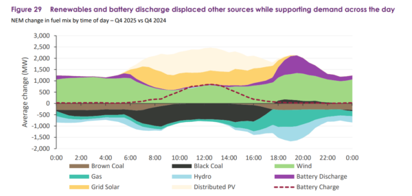 Average battery charging in the WEM also increased by 81 MW or 199%, helping to manage high distributed solar output during the day, and batteries contributed 4.2% to the total energy mix, up from 1.4% in Q4 2024.