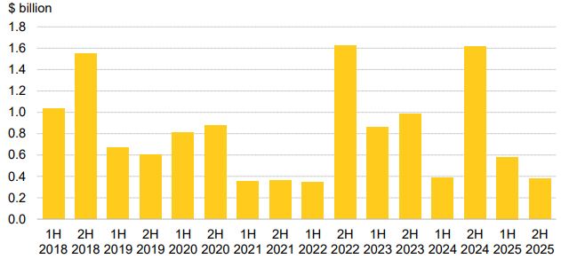 While investment levels dropped, more than 1.5 GW of utility-scale solar capacity was commissioned across Australia in the second half of 2025, up from the 241 MW commissioned in the first half. The increase took total operational large-scale solar capacity in Australia to 15 GW.