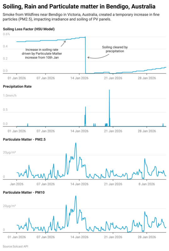 The hot and dry pattern also heightened bushfire risk and dust mobilisation, creating additional complexity for PV operations. Strong northerly winds preceding southern cold fronts drove dangerous fire weather in Victoria and NSW, with smoke temporarily reducing irradiance at nearby sites. In Bendigo, analysis of particulate matter concentrations and rainfall indicates a noticeable uptick in estimated soiling losses around 11 January, coinciding with nearby fire activity. Subsequent rainfall helped wash panels clean, limiting the persistence of these losses. Although fire episodes reduced irradiance locally and temporarily, they did not materially alter the overall monthly above-average signal, as similar events appear in the historical January baseline.