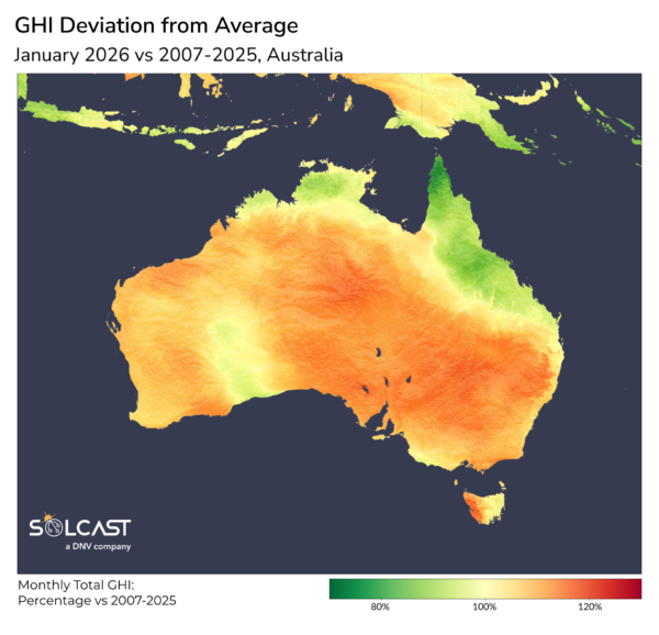 Most of Australia recorded above average irradiance in January 2026 as a hot, dry continental airmass dominated the month, despite localised reductions from bushfire smoke, dust, and an active monsoon in the tropical north, according to analysis using the Solcast API. While widespread sunshine supported strong conditions for PV generation, elevated temperatures, smoke events, and dust soiling created operational challenges. In contrast, northern Queensland and far north of Australia experienced significant irradiance deficits under persistent monsoonal cloud and Tropical Cyclone Koji.