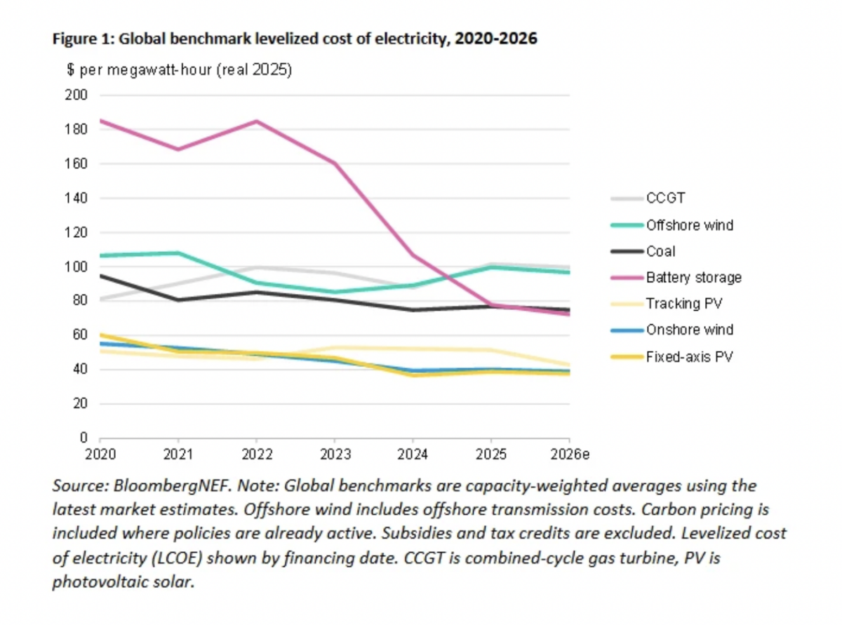The analyst’s Levelised Cost of Electricity 2026 report says that while benchmark costs for solar all rose in 2025, due to a combination of supply chain constraints, poorer resource availability and market reforms in China, innovation and competition will lead to declining costs over the next decade.