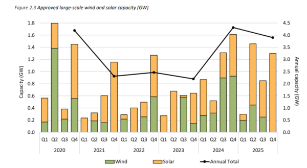 “2025 was also the first year on record with multiple quarters seeing more than 1 GW of large-scale solar approvals, with 1 GW being approved in Q2, and 1.3 GW being approved in Q4.”