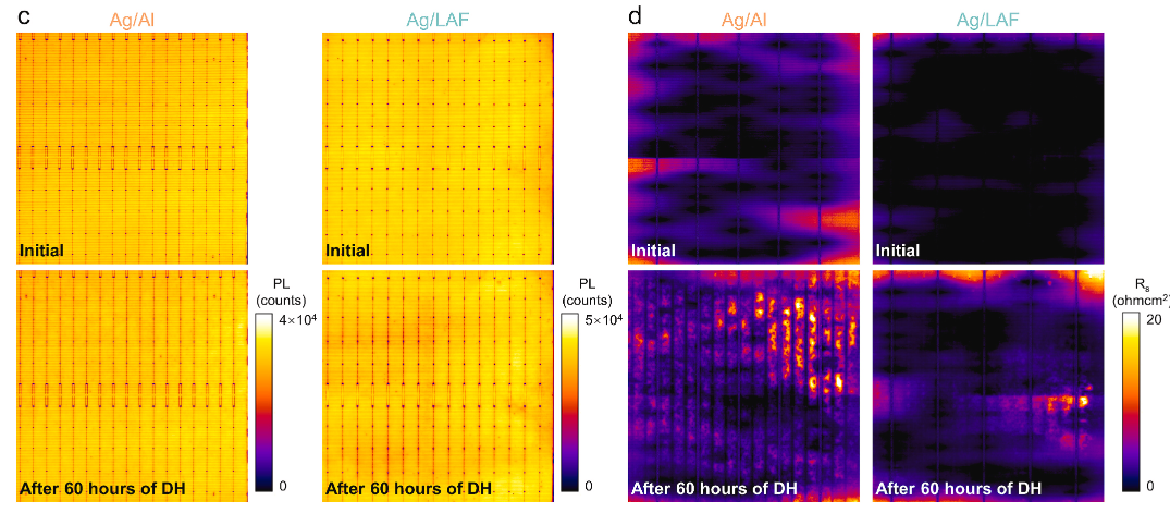 The tests showed that the Ag/Al and Ag/LAF cells showed different degradation behaviors, with Ag/LAF contacts exhibiting higher sensitivity to acidic conditions and pronounced losses in efficiency and fill factor due to front-contact delamination.