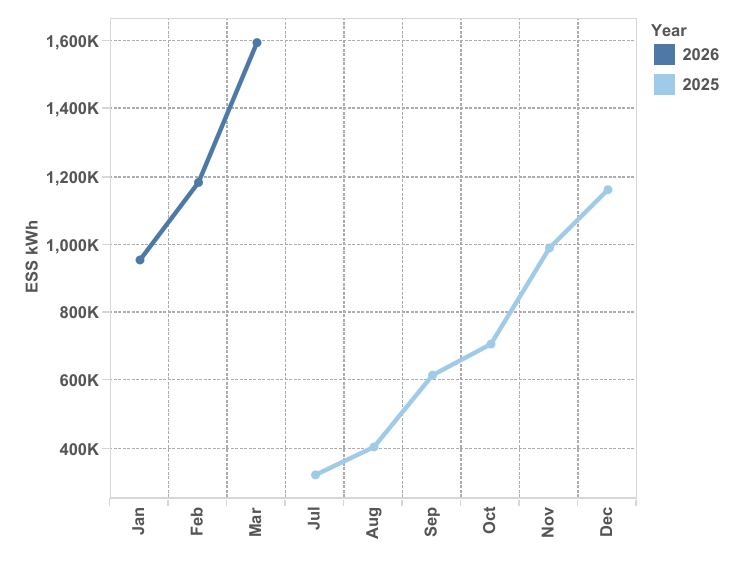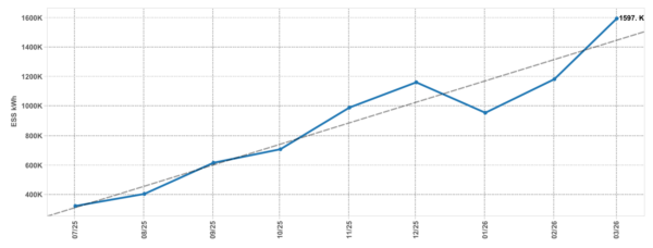 SunWiz data shows almost 1.6 GWh of small-scale energy storage capacity was installed across the country in March 2026, a 35% increase on the previous month and a record high for monthly capacity registered.