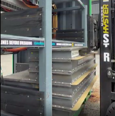 The batteries have a range of between 200 km to 600 km depending on the load up to 170 tonnes, are swappable in four minutes and recharge lasts approximately four hours.